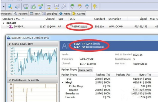 注:只有当存在客户端连接到此隐藏 WiFi 热点时,"commview for wifi"程序才能找到隐藏 WiFi 热点对应的 SSID 名称。