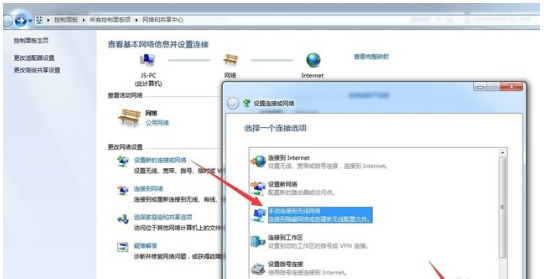 5. 最后我们只需要在"网络和共享中心"界面中,点击"设置新的连接和网络"按钮,并在弹出的窗口中选择"手动连接到无线网络",并点击"下一步"按钮。