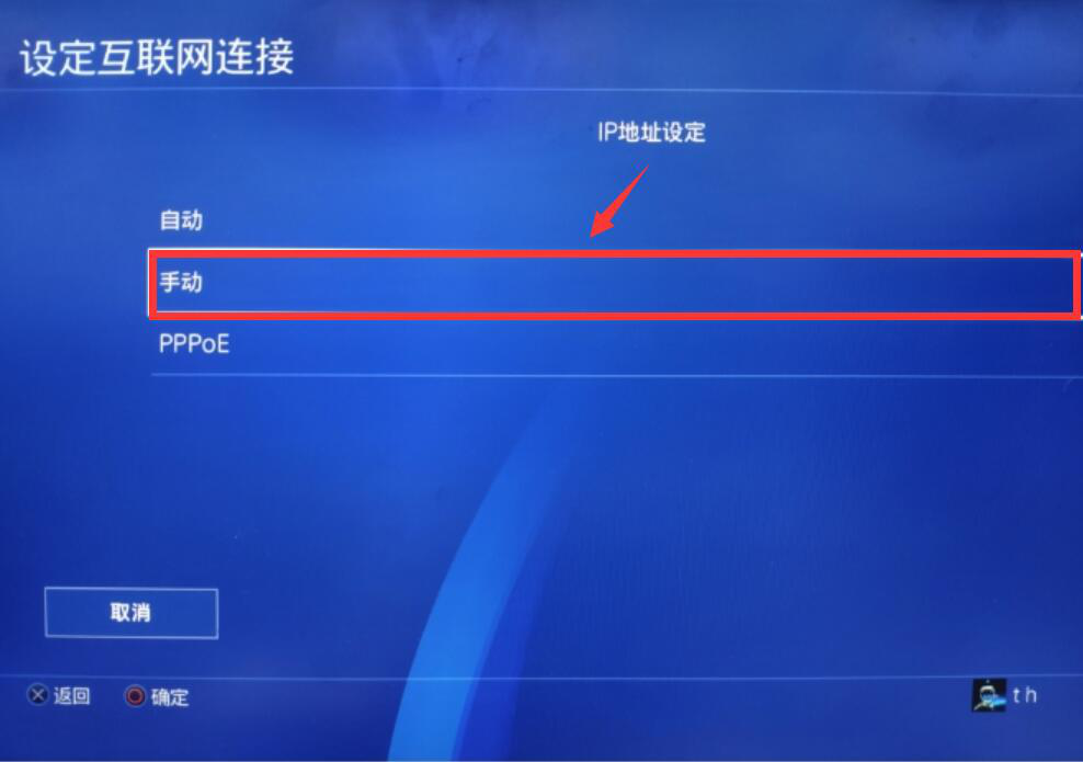 7. 在"IP 地址设定"的向导页中,选择"手动",并填写第3步中雷神加速器弹出的 PS4 参数设置中的IP地址. 默认网关. 子网掩码. DNS。