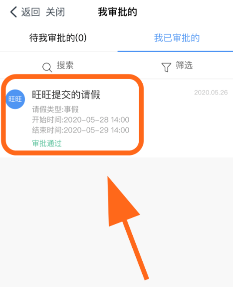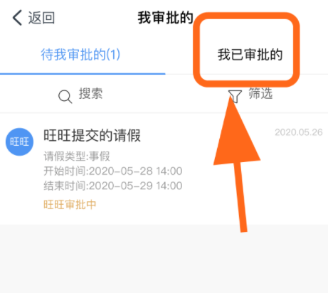 进入审批窗口,点击"我审批的"一栏,打开列表,点击"我已审批的"选项,