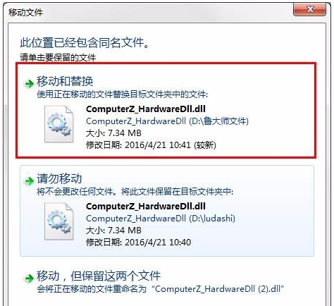 将刚才下载的"ComputerZ_HardwareDll.dll"文件复制粘贴到鲁大师安装根目录,跳出提示,点击"移动和替换"选项,