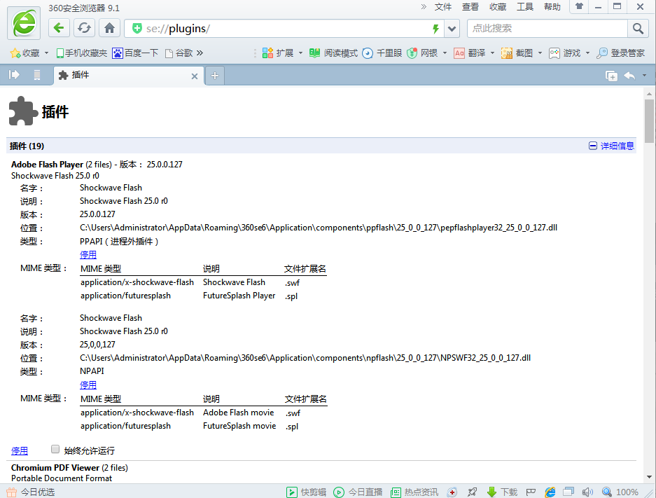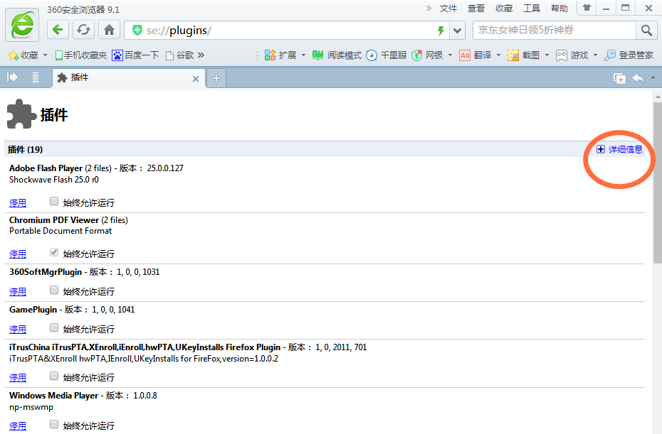 你在 360 浏览器地址栏输入"chrome://plugins"回车,点右上方的"详细信息",