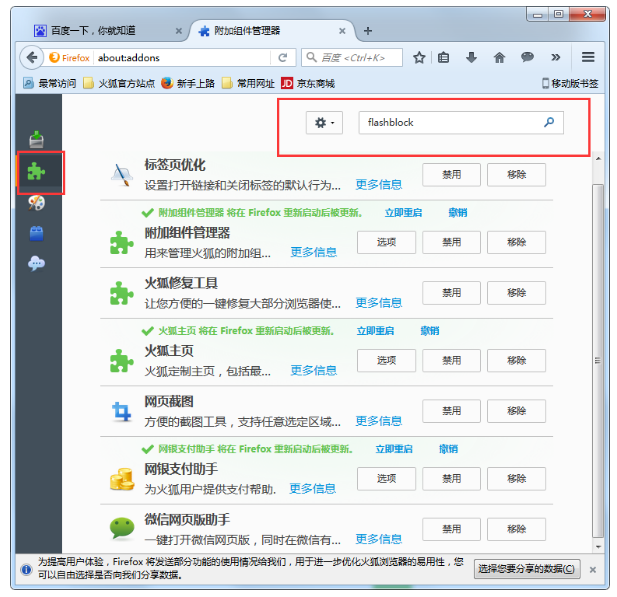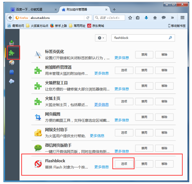 4. 之后在火狐浏览器附加组件的"扩展"里就可以看到已经安装好的"flashblock"了;