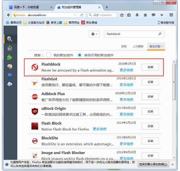 3. 搜索完毕后我们点击安装"flashblock",安装完毕后重启一下火狐浏览器;