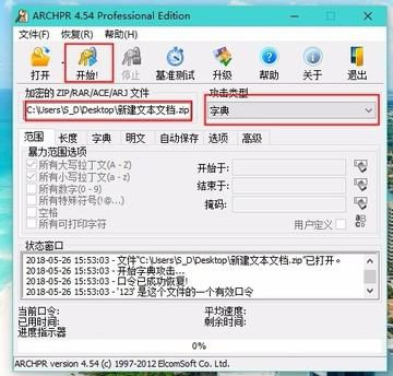 双击打开 Advanced Archive Password Recovery,进入界面,点击"打开",导入需要破解的ZIP文件,选择"攻击类型"为字典,然后点击"开始"按钮,