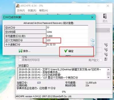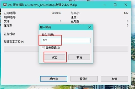 接下来进行验证,解压 ZIP 压缩包,输入密码 123,点击确定,解压成功,