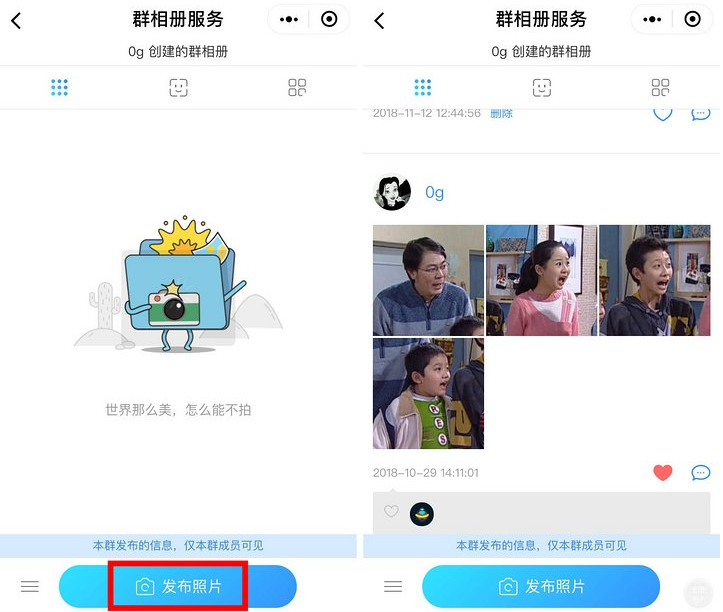 好友加入之后,便可发布照片。点击主页下方的"发布照片",从相册中选择需要备份的图片上传到群相册,每次上传的照片数量必须小于等于9张照片,就和发朋友圈一样。