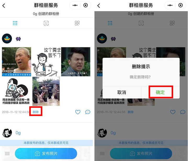 成功上传至"群相册服务"小程序中的照片,将会被永久保存。当然,你也可以对照片进行管理,删除没用的照片,打开所在的群相册图片,在图片下方点击删除,即可删除不需要的照片。