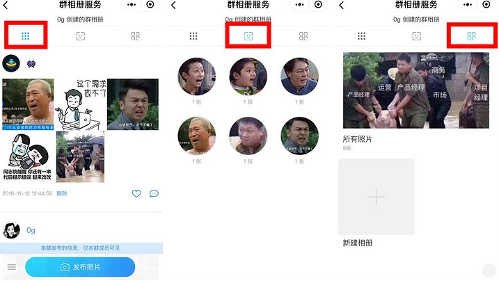 群相册顶部还有三个小图标,分别对应着主页、群相册头像以及相册管理功能,方便你快速找到群内照片、管理群相册。