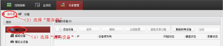 2. 然后,在海康 4200 的控制面板中,点击"设备管理"。进入"设备管理"页面后,切换到"服务器"界面,点击"编码设备"。