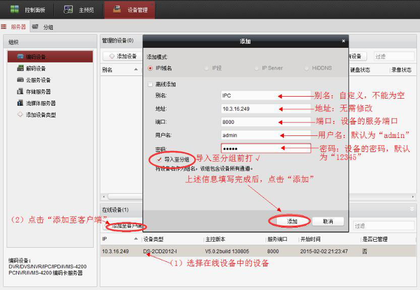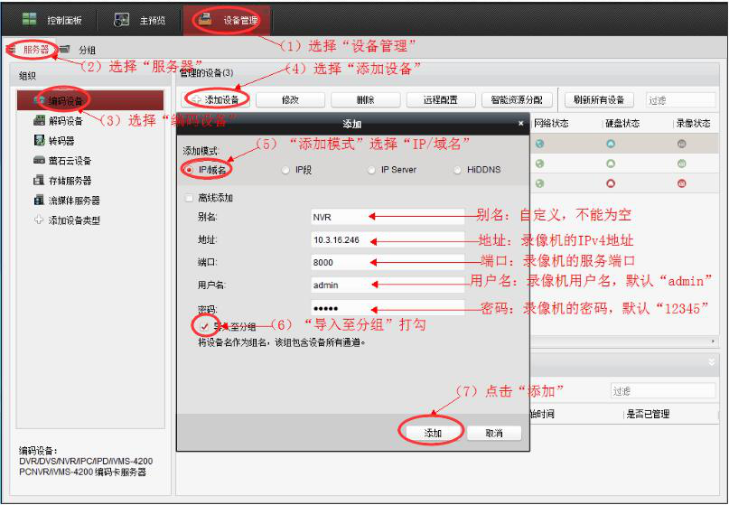6. 如果海康威视在添加设备的过程中,发现在线设备里没有设备,那么就在设备管理的编码设备操作界面中,点击"添加设备"按钮,再在它弹出来的窗口中,输入相关信息,并勾选"IP/域名"和"导入至分组",再点击"添加"按钮。