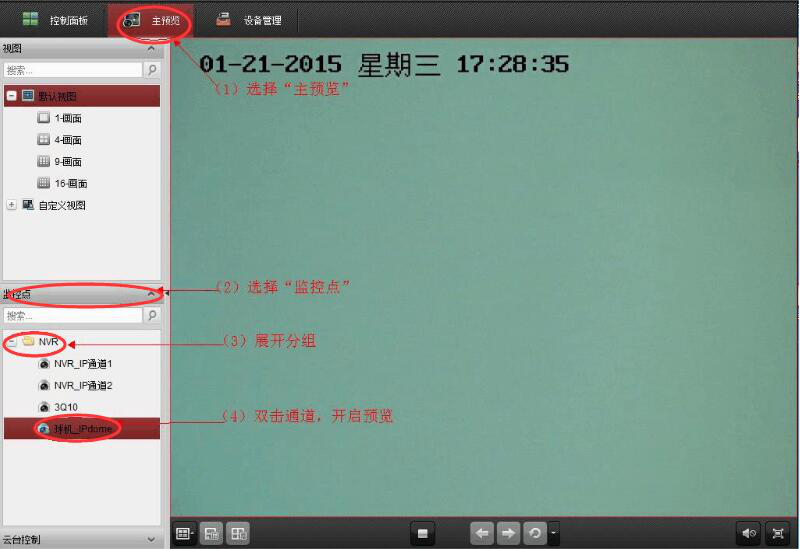 5. 海康 4200 设备成功添加,回到其主界面,点击菜单栏中的"主预览",并在界面左侧栏中选择监控点. 点击 NVR 文件夹展开海康 4200 设备分组,双击自己想要查看的通道,便可以开启预览了。