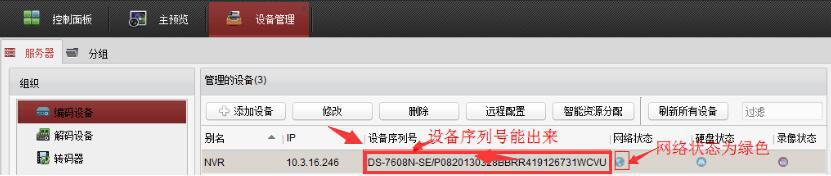 4. 此时,用户便可以发现海康 4200 成功添加了设备。可以看到该设备的序列号. 网络状态等等。