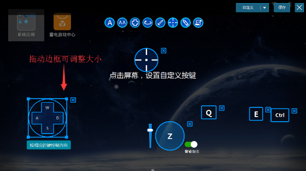 4. 另外在该界面的顶部还可以看到有很多特殊按键,比如说"方向键. 射击键. 攻击键"等,将他们拖动到游戏中对应的位置就可以了;