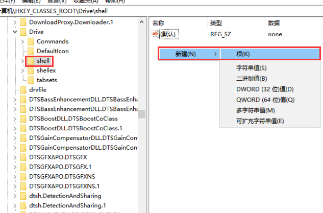 依次点击"HKEY_CLASSES_ROOT\\Drive",选择"shell",在右侧窗口空白处点击右键,弹出菜单,点击"新建"——"项",命名为"runas",