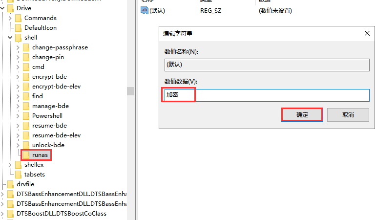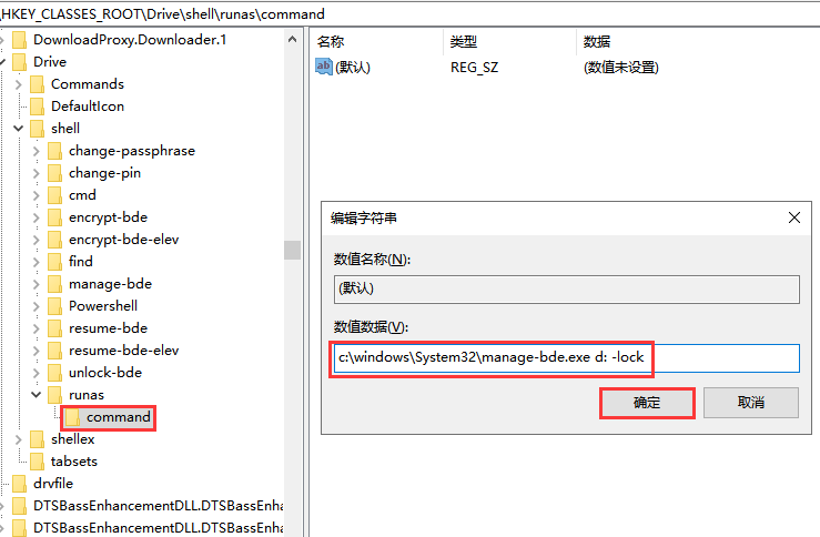 在窗口左侧点击"shell",然后使用鼠标右击右侧空白区域,点击"新建"——"项",命名为"command";最后双击打开默认项,弹出对话框,在"数值数据"中输入"c:\\windows\\System32\\manage-bde.exe d: -lock",点击确定。