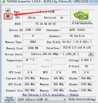 4. 接下来,我们点击 nvidia inspector 界面右侧的此图标,便可以看到 GeForce 驱动的实际情况了。
