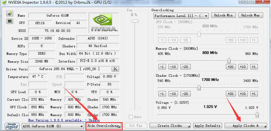 5. 最后,我们点击 nvidia inspector 界面下方的"Hide Overclocking "按钮,便可以在展开的超频面板中根据自己的情况来调节频率,调节完成,再点击"Apply Clocks"按钮。