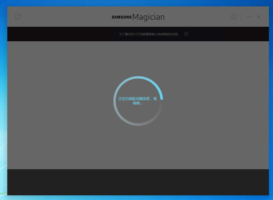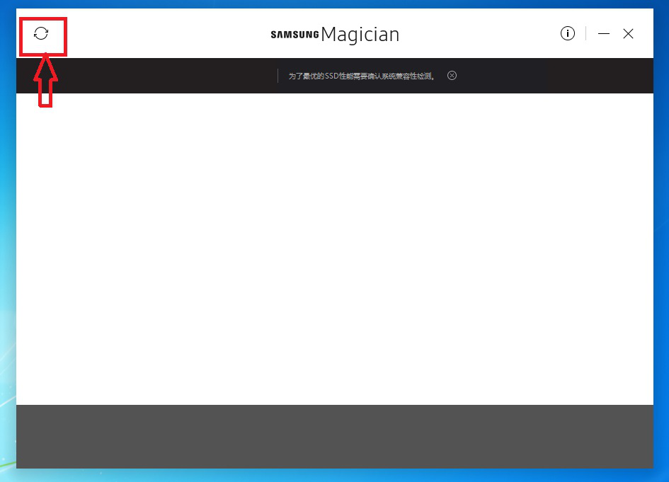 10. 进入 Samsung Magician 软件主界面,如果没有硬件显示,则点击左上方刷新图标,即可即使扫描本机硬盘属性。然后根据需要维护优化即可。