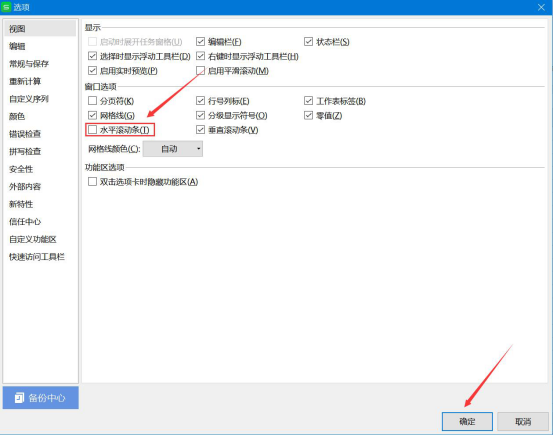 3. 接下来,在"选项"的窗口中,切换至"视图"页面,勾选"水平滚动条",再点击"确定"按钮,即可解决 excel 表格无法左右移动的问题了。