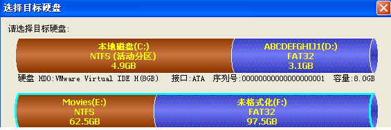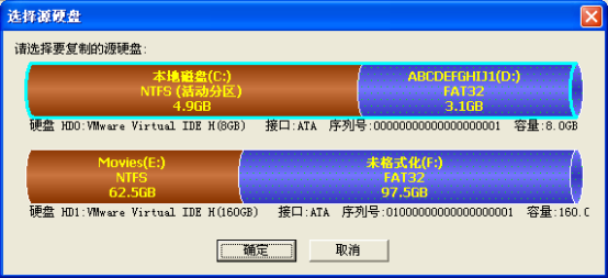 2. 该对话框打开后,程序会自动弹出源硬盘及目标硬盘选择对话框。如下图所示: