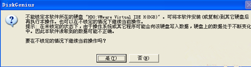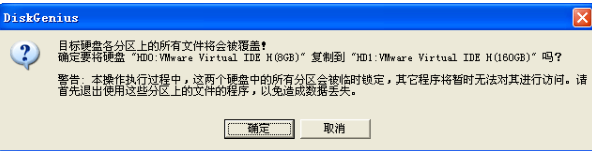 4. 请确认目标硬盘上没有重要数据,或重要数据已做好备份。确认无误后点击"确定"按钮 。程序将尝试锁定两个硬盘中的所有分区。如果无法锁定源硬盘中的分区(无法锁定的分区一般包括系统分区及本软件所在的分区),程序将显示类似下面的提示信息: