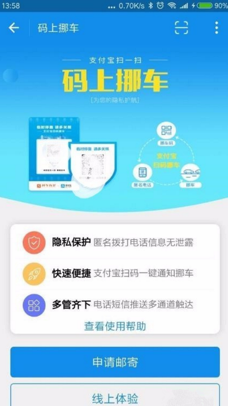 5. 当然也可以线上体验,然后自己打印出来,点击线上体验,进入后输入自己车牌号和手机号码,接收验证码,确定绑定,生成挪车二维码,