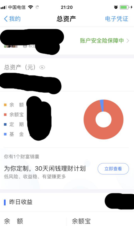 2. 进入"总资产",在这个位置我们就能看到"账户安全险保障中"。