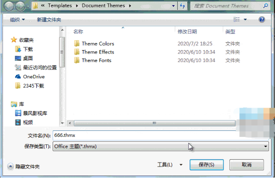 3. 弹出新窗口,保存当前主题到文件,并设置文件名,最后点击“确定“。这样原格式主题就会保存在自定义主题中。
