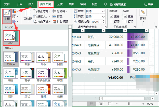 4. 打开复制的表格,点击“页面主题“-“主题“,选择刚刚保存的主题。