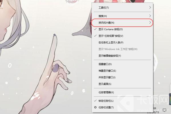 2.右击任务栏的空白处唤出任务栏菜单,找到上方的“资讯和兴趣”一览;