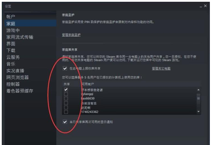 进入设置界面,如图,点击选择“家庭“选项,勾选“在此电脑上授权库共享“,即会显示出曾经在这台计算机中登录的所有 Steam 账户,