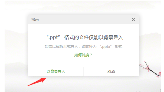 如图,提示”. PPT 格式的文件仅能以背景导入””代表 PPT 中的每一页内容出现在希沃会变成整张图片,不能更改,所以你需要将低版本的 PPT 文件修改为高版本,