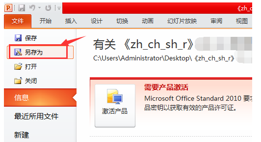 必须用 2007 或者 2010 版本的 PowerPoint 打开课件,因为高版本软件能够兼容低版本,如图,点击”文件”——”另存为”,