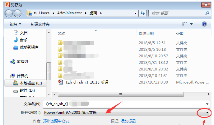 弹出对话框,选择保存类型,将”PowerPoint 97 - 2003 演示文稿”修改为”PowerPoint 演示文稿”,点击保存,
