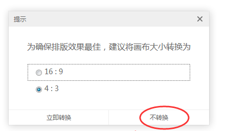 接着重新导入 PPT 课件,出现提示,建议转换画布大小,注意,希沃课件的比例是 16:9, PPT 课件是 4:3,需要选择 16:9 的比例进行转换,