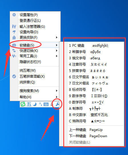 1. 首先用快捷键“Ctrl+Shift”切换出搜狗五笔输入法,在它的状态栏上点击“菜单”按钮,接着在弹出的选项列表中找到“软键盘”;