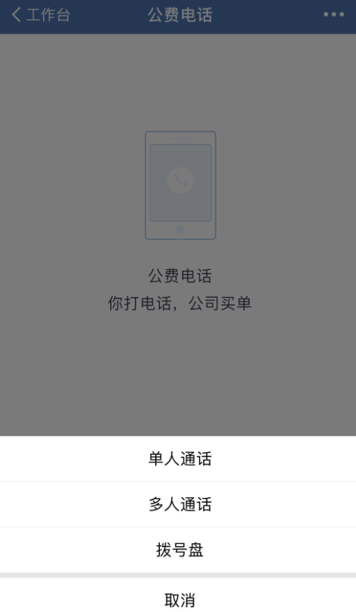 入口 2. 打开企业微信,进入首页,点击”工作台”——”公费电话”——”打电话”,选择”单人通话”,然后选择联系人,点击手机号,进行拨打。