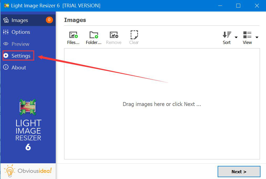 1. 首先,我们进入 Light Image Resizer 操作界面。在左侧功能栏中,找到并点击“Settings”设置选项。