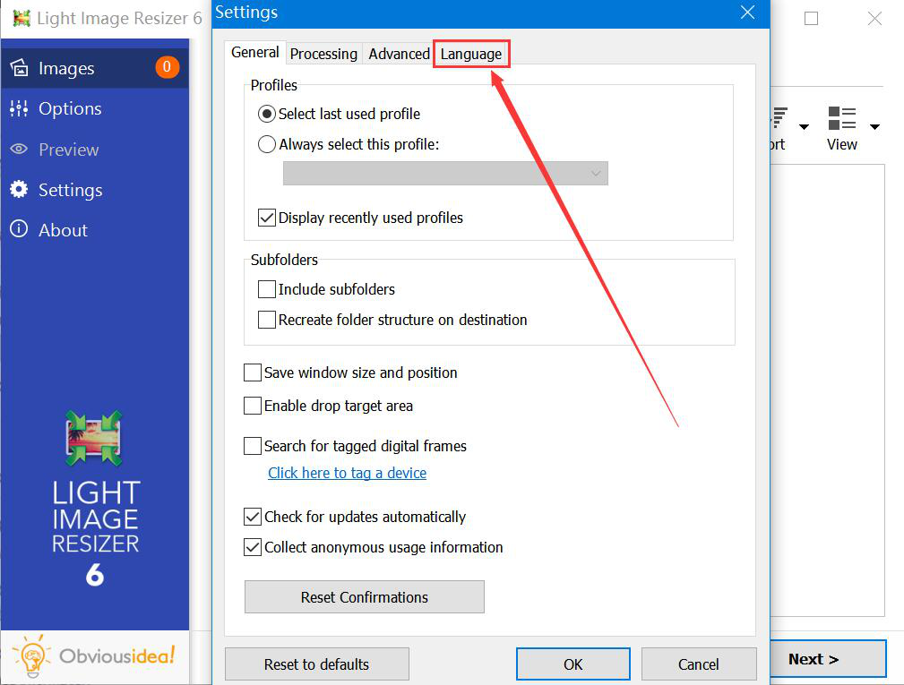2. 然后, Light Image Resizer 会弹出“Settings”窗口,我们找到并点击切换至“Language”语言设置选项卡。