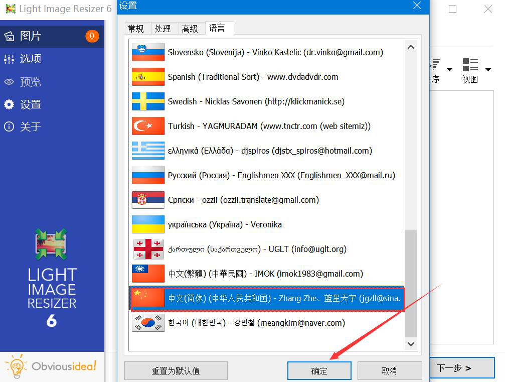 3. 接下来,在语言列表中,我们点击并应用中文(简体),便可以预览 Light Image Resizer 界面设置为中文的效果。确定应用的话,就点击“确定”按钮。当然了,有些人比较习惯看繁体字,在用 Light Image Resizer 将界面设置中文时,也可以选择应用中文(繁体)。