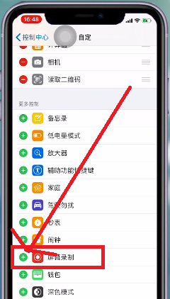 4. 进入自定控制界面后,下拉屏幕找到屏幕录制,带你击屏幕录制前方的绿色加号,加入到上方的自定控制。