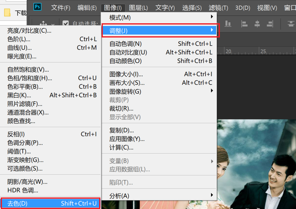 然后在菜单栏中点击“图像”——“调整”——“去色”,如图,