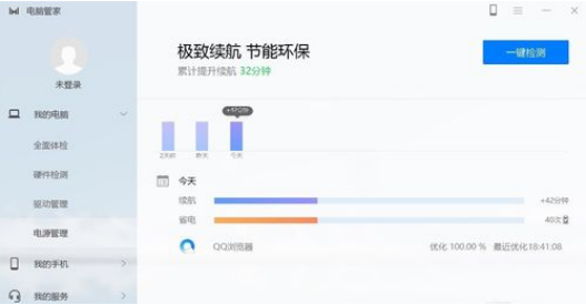 4. 点击软件界面左侧列表的“电源管理”,可以一键检测,达到极致续航、节能环保的效果,还可以查看续航时间和省电次数,如下图: