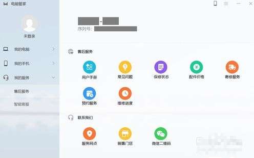 6. 点击软件界面左侧列表的“我的服务”,可以查看产品序列号、用户手册、常见问题、保修状态、配件价格等信息,还可以查看服务网点、销售门店、微信二维码,全面保障了售后,如下图: