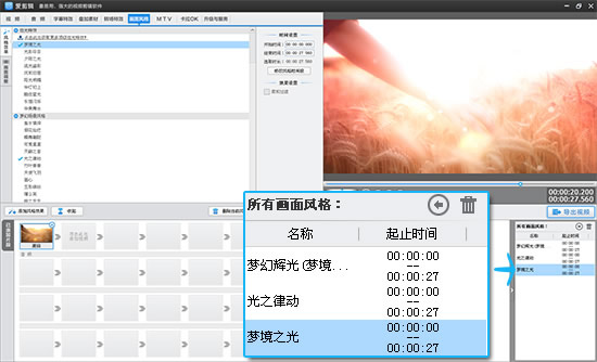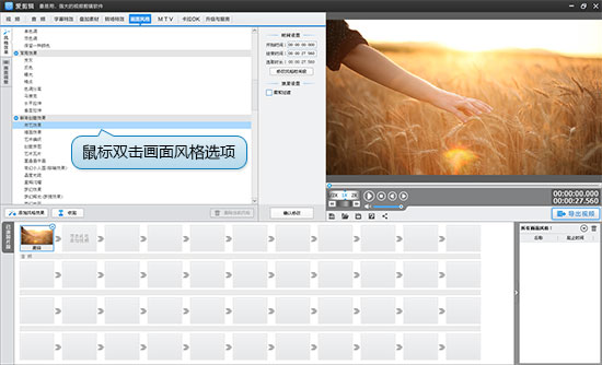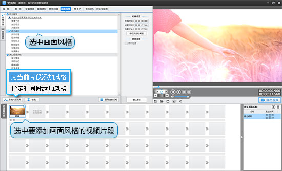在“画面风格”面板的“风格效果”或“画面调整”栏目下,鼠标双击要添加的画面风格,在弹出的“选取风格时间段”对话框中,设置要添加画面风格的时间段即可。