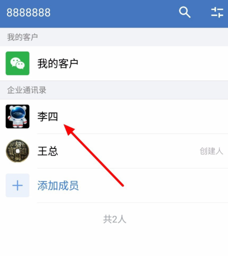 在手机中打开企业微信,进入界面,点击“通讯录“,如图,找到离职的成员,
