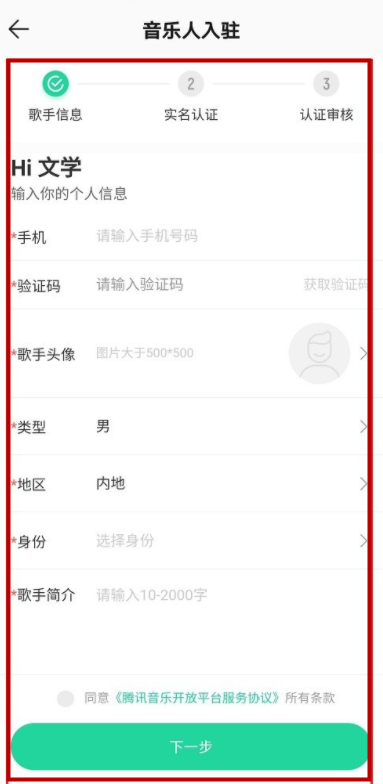 出现音乐人入驻窗口,如图,输入歌手名字,点击底部的立即创建,然后填写歌手信息,进行提交,审核通过之后,即可认证 QQ 音乐 歌手。