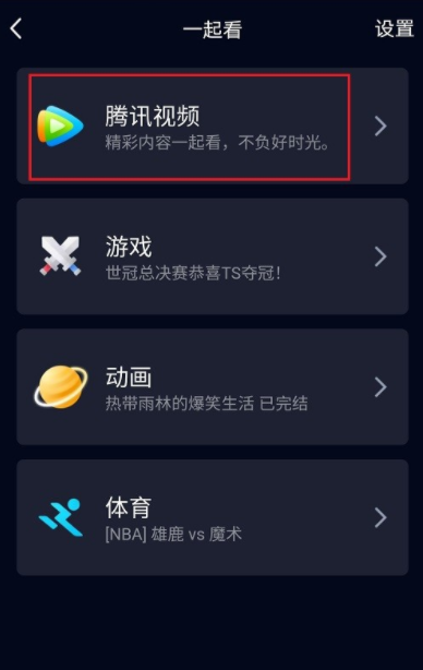 打开 QQ 一起看功能,进入以下界面,如图,点击“腾讯视频”,
