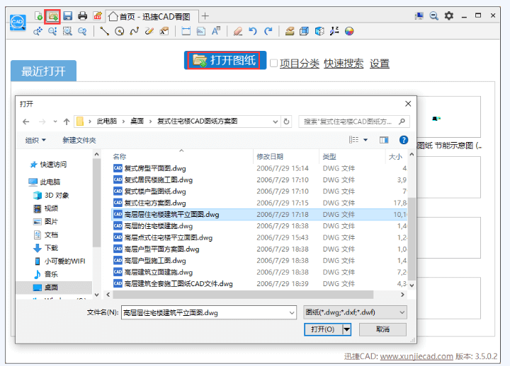 如图,在菜单栏中点击打开文件选项,弹出对话框,选择 CAD 图纸,或者你可以直接点击“打开图纸“按钮,导入图纸文件,